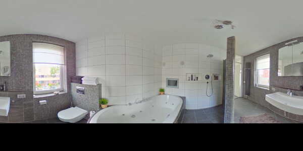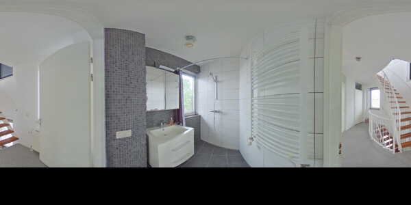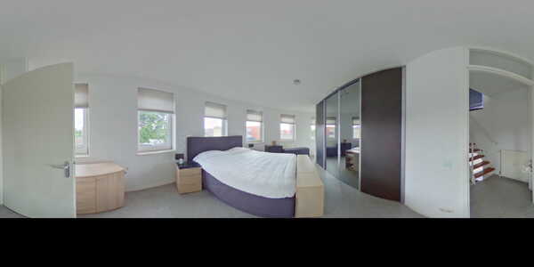De ouderslaapkamer met een vaste kast en een en-suite badkamer vindt u op de eerste verdieping. Deze complete badkamer is voorzien van een douche, whirlpool, ingebouwde tv, tweede toilet en een wastafelmeubel. De afwerking is in grijs en wit tinten gecombineerd met wit sanitair.