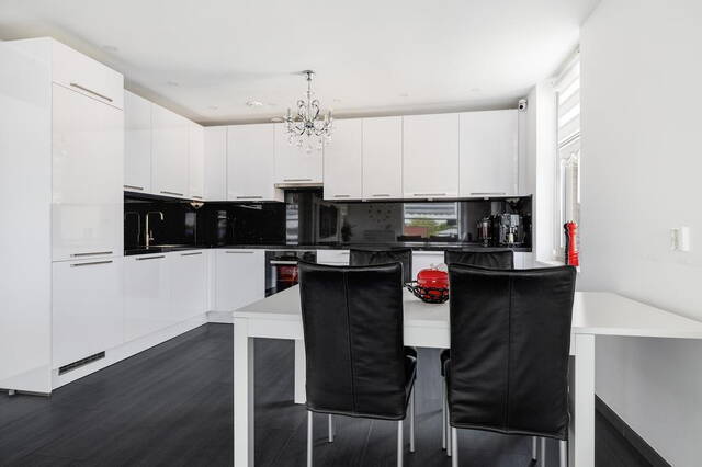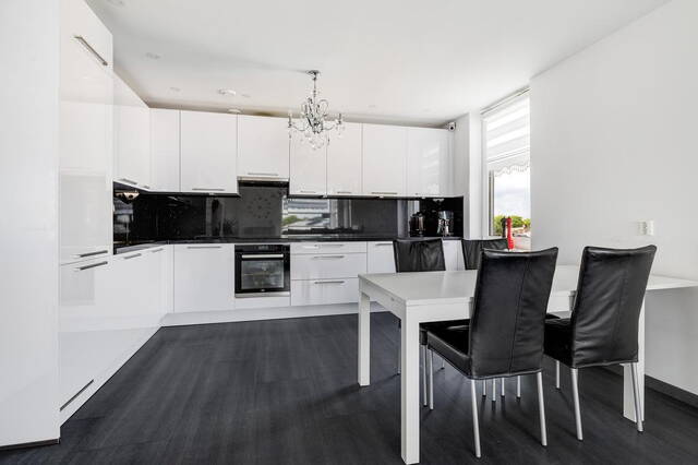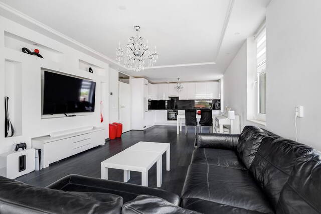 De royale woonkamer, gesitueerd aan de voorzijde, heeft toegang tot een groot balkon waar u in alle privacy kunt ontspannen. De ruimte is afgewerkt met gladde muren en een gestuukt plafond. De open keuken is modern en voorzien van alle gemakken, inclusief een royaal granieten werkblad. De keuken, uitgevoerd in wit met een zwart blad, biedt veel opbergruimte en is volledig uitgerust met apparatuur die onder garantie valt tot 2025 (installatiejaar 2020).