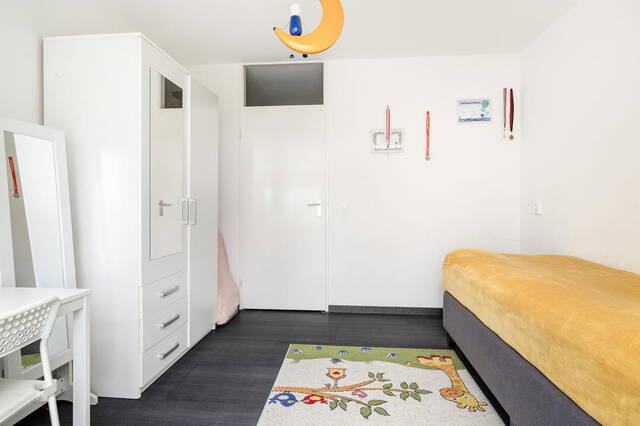 De ouderslaapkamer bevindt zich ook aan de voorzijde en biedt, net als de woonkamer, toegang tot het grote balkon.