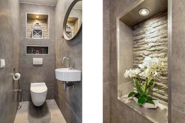 De badkamer, vernieuwd in 2020, is luxe en stijlvol afgewerkt. Deze beschikt over een inloopdouche, een wastafelmeubel en een tweede toilet. De neutrale kleuren en hoogwaardige materialen maken het tot een aangename ruimte.
