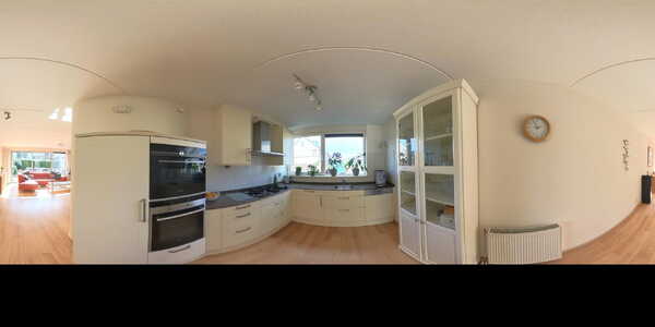 De open keuken aan de voorzijde is compleet uitgerust met de gebruikelijke inbouwapparatuur: een koelkast, heteluchtoven, combi-oven, vaatwasser, 5-pits gaskookplaat, afzuigkap en een close-in boiler. De lichte opstelling en het taupekleurige composieten aanrechtblad geven de keuken een rustige uitstraling.