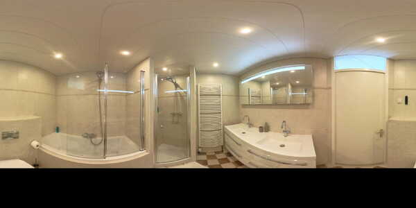 De ruime badkamer is geheel betegeld en compleet uitgerust met een ligbad met spatscherm, een hoekdouchecabine, een dubbele wastafel met meubel, design radiator en een tweede toilet.