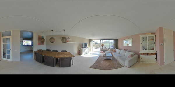 Je parkeert de auto op de oprit en zet de fiets die nog buiten is blijven staan in de schuur aan de voorzijde. Dan loop je achter de voordeur de hal binnen. Een ruime hal waar je je jas ophangt en al dan niet je schoenen in het rek zet. Dan loop je de woonkamer in. Die is heerlijk ruim, de woonkamer is 1,76 meter uitgebouwd, maar ook de mooie lichte marmeren vloer en de grote pui aan de achterzijde geven een heel ruim effect. De woonkamer is verdeeld in een gezellige eethoek en een hele ruime zithoek.