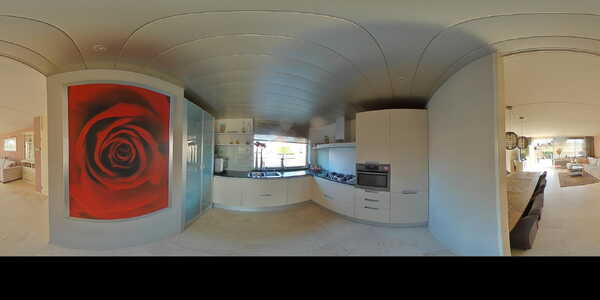Terug in de woonkamer lopen we langs de trapkast waar zoals bij de meeste mensen de stofzuiger staat en de nodige proviand. Daarnaast treffen we daar de verdeler van de vloerverwarming. De marmeren vloer is een perfecte geleider voor de vloerverwarming en is tevens lekker koel in de zomer! Aan de voorzijde lopen we de half-open keuken in. De afscheidingsmuur is eigenlijk wel fijn, want daar past mooi de eettafel aan de andere kant tegenaan! De keuken is voorzien van diverse inbouwapparatuur zoals de vaatwasmachine, koelkast, vriezer, combi-oven en de ingebouwde 5-pits gaskookplaat met afzuigkap erboven. In het natuurstenen keukenblad zit een dubbele spoelbak met mengkraan en zeepdispenser verwerkt. In de laden en kastjes is veel bergruimte en door het grote raam komt veel werklicht binnen en kijk je mooi vrij de straat in.