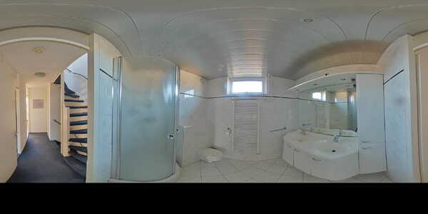 De badkamer bevindt zich aan de voorzijde is voorzien van een douchecabine, een grote dubbele wastafel met wastafelmeubel met twee mengkranen en een grote spiegel. Daarnaast treffen we hier het tweede toilet en een radiator waar je de handdoeken kunt drogen. Door het bovenlicht komt fijn daglicht binnen en de badkamer is voorzien van mechanische ventilatie.