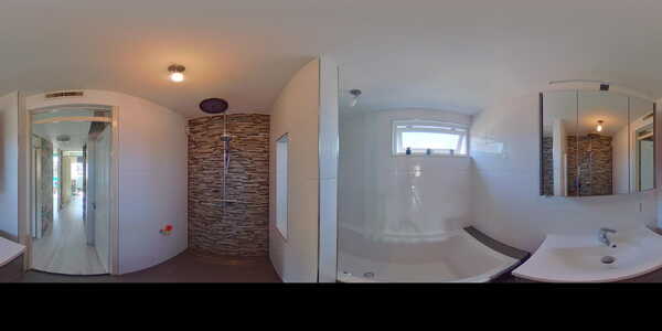 Dan nemen we de trap naar de eerste verdieping, waar we drie slaapkamers aantreffen. De hoofdslaapkamer is 15 m², de andere twee kamers zijn 9 en 7 m² groot. De badkamer is in 2019 volledig gerenoveerd en voorzien van een ruime inloopdouche, een ligbad, een wastafel met mengkraan, wastafelmeubel en een spiegelkast erboven. Een mooie, strakke, neutrale badkamer met mechanische ventilatie.