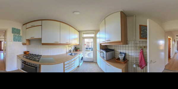 De keuken bevindt zich in een aparte ruimte en is voorzien van een 4-pits gaskookplaat, afzuigkap, heteluchtoven, koel-vriescombinatie en een close-in boiler. Ook is hier een aansluiting voor de wasmachine aanwezig. Vanuit de keuken is er directe toegang tot de achtertuin. Deze diepe tuin, gelegen op het noordwesten, beschikt over een stenen berging, een houten overkapping en een achterom.