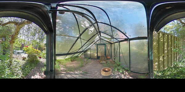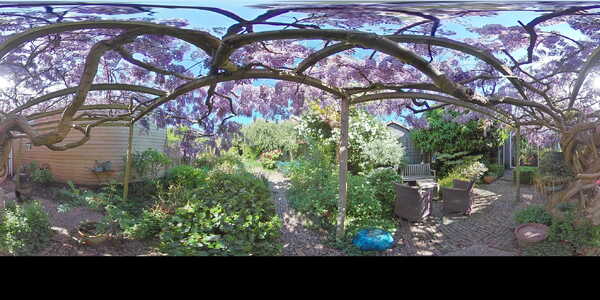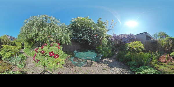Vanuit de woonkamer aan de voorzijde heb je toegang tot de trapkast waar zich de meters bevinden en waar je bijvoorbeeld de stofzuiger kwijt kunt. De aangebouwde achterkamer is heel subtiel voorzien van een smal hoog raam waardoor je over het zijpad naar voren wegkijkt. Aan de achterzijde is een grote schuifpui geplaatst, zodat je zo de tuin inloopt. Laten we daar eerst maar eens doorheen gaan lopen, want de tuin is echt een oase van rust. De achtertuin is ruim 21 meter diep en 7,43 meter breed. Dat is een behoorlijk oppervlak en dat is dan ook verdeeld in een gezellig gedeelte waar je lekker zit te eten, een leuk borrelhoekje, een kas, berging en heel erg veel groen! Deze tuin is met veel gevoel en inzicht gecreëerd. Alleen de blauwe regen al is een lust voor het oog, je kijkt hier je ogen uit. Je kunt hier dan ook uren in aan de slag en als je nog geen groene vingers had, dan worden ze dat hier wel.