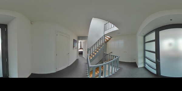 Ruime overloop met toegang tot alle vertrekken en trap naar de 2e verdieping. De overloop is afgewerkt met tapijtvloer.