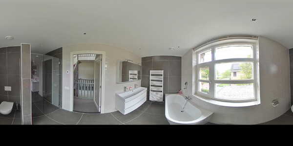 Moderne badkamer (ca. 9 m2) met sanitaire voorzieningen zoals een grote wastafel met twee kranen en wastafelmeubel, spiegel met spiegelmeubel en verlichting, hangend tweede toilet, ligbad, inloopdouche met regendouche en designradiator. De badkamer is geheel betegeld en afgewerkt met elektrische vloerverwarming, hor, spotjes en handmatig bedienbaar markies.