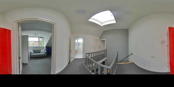 Ruime overloop met een grote lichtkoepel en toegang tot alle vertrekken en de technische ruimte. De overloop is afgewerkt met tapijtvloer.