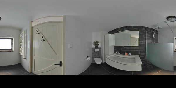 Moderne badkamer (ca. 6 m2) met sanitaire voorzieningen zoals een grote wastafel met wastafelmeubel, spiegel met spiegelkast en verlichting, hangend tweede toilet, inloopdouche met regendouche en designradiator. De badkamer is geheel betegeld in wit/grijs kleurstelling.