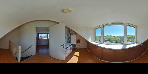 Voorzolder met stelplaats voor de HR C.V. combiketel (Remeha 2023), wasmachine- en drogeraansluiting, een kunststof dakkapel met elektrisch bedienbaar screen en bergruimte achter het knieschot. De voorzolder is afgewerkt met laminaatvloer.