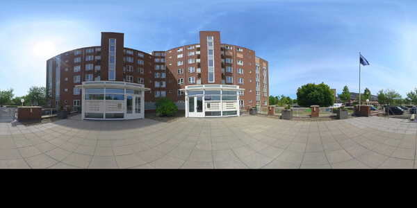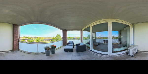 Het zonneterras (ca. 19 m²) op het westen biedt een panoramisch uitzicht, inclusief zicht op de skyline van Rotterdam, en is voorzien van een elektrisch zonnescherm over de volledige breedte. Een glazen zijwand zorgt ervoor dat je ook op winderige dagen comfortabel buiten kunt zitten.