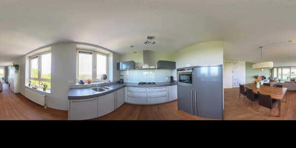 De moderne open keuken (ca. 7 m²) in hoekopstelling is uitgevoerd in lichtgrijze tinten en voorzien van hoogwaardige inbouwapparatuur, waaronder een koelkast, vriezer, 5-pits gaskookplaat, RVS afzuigkap, oven, vaatwasser en een close-in boiler. De keuken beschikt bovendien over een vrijstaande kast met de apparatuur.