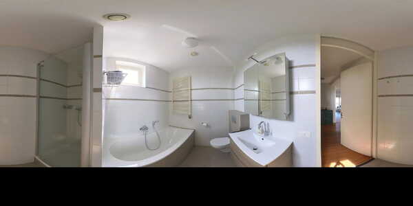 De ruime badkamer (ca. 6 m²) is compleet uitgerust met een douchecabine, ligbad, modern wastafelmeubel met spiegel en verlichting en een hangend toilet. De badkamer is volledig betegeld in een stijlvolle wit-grijze kleurstelling en beschikt over comfortabele vloerverwarming.