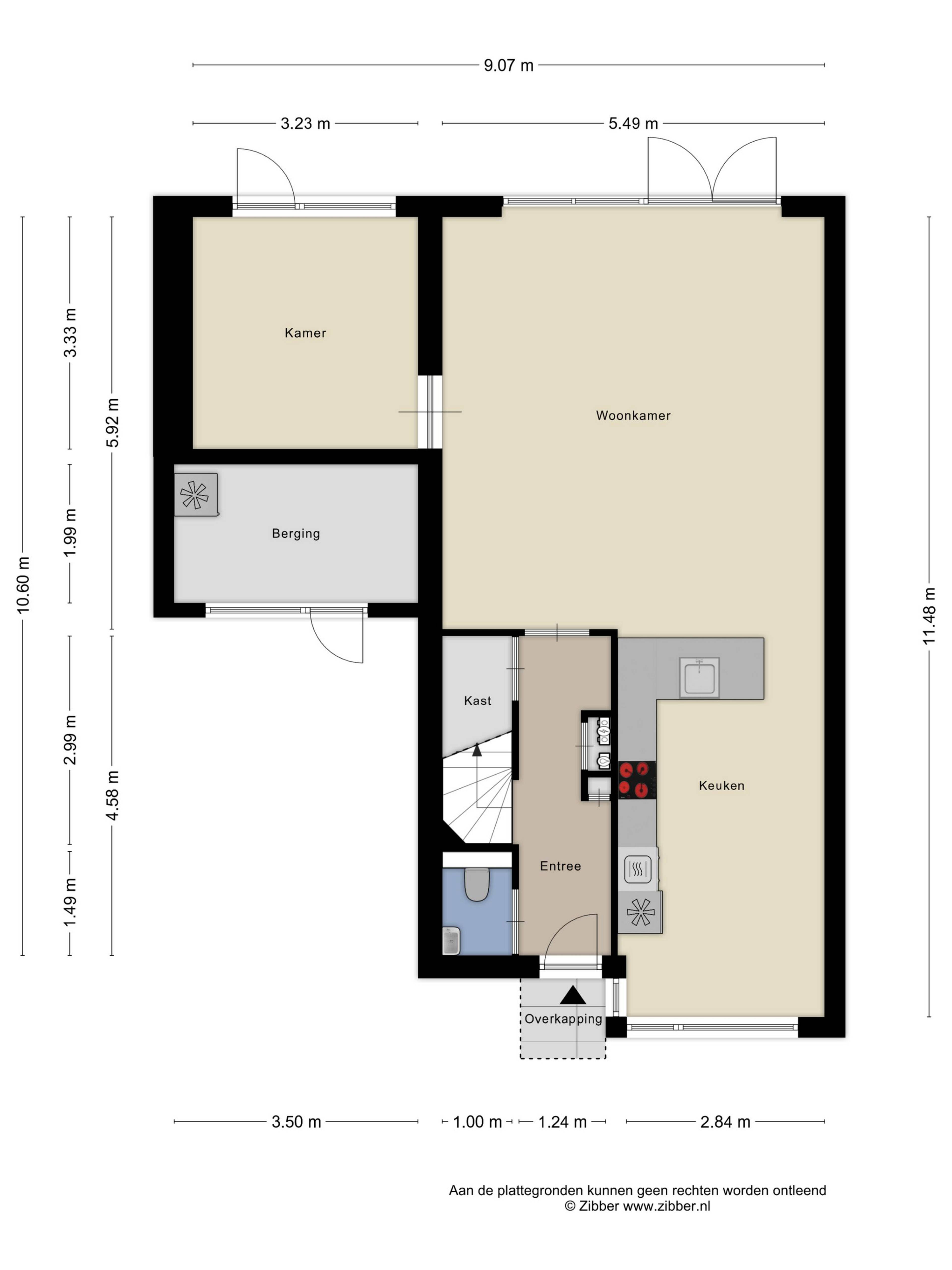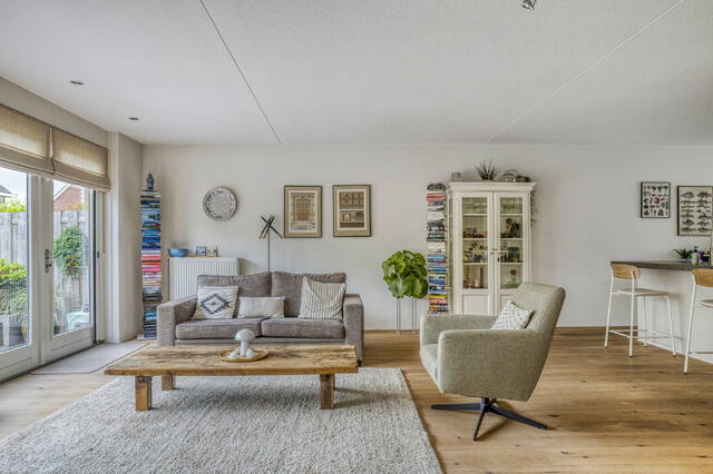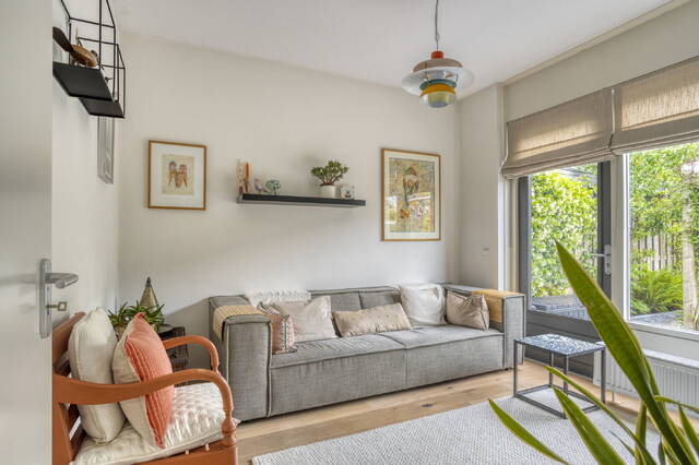 Via de nette entree met toilet, trap en handige trapkast kom je in de ruime, lichte woonkamer met eikenhouten vloer en openslaande deuren naar de tuin. De woning is aan de achterzijde uitgebouwd met een sfeervolle tuinkamer – perfect als werkplek, speelruimte of extra zithoek – met ook hier directe toegang tot buiten.