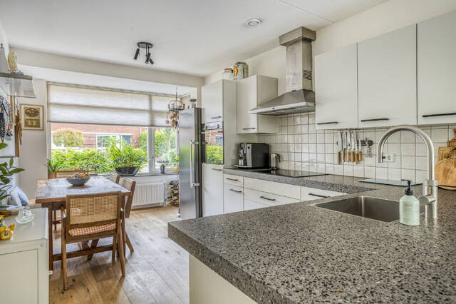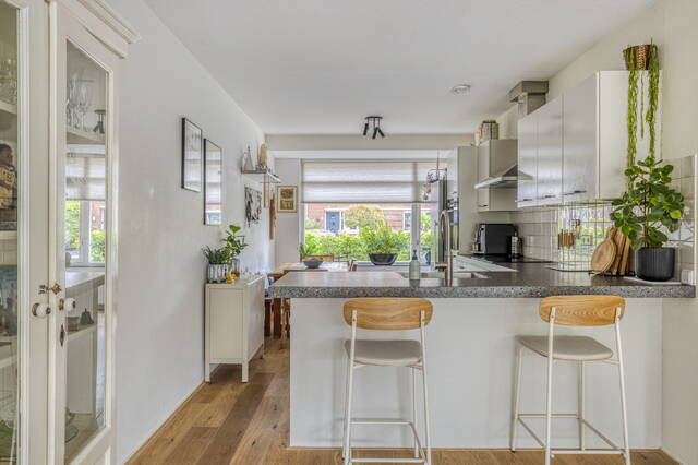 Aan de voorzijde bevindt zich de moderne keuken in hoekopstelling, uitgerust met hoogwaardige inbouwapparatuur (vernieuwd ca. 4 jaar geleden), waaronder een Quooker, inductiekookplaat, combi-oven en vaatwasser. Het karakteristieke erkerkozijn zorgt hier voor een mooie lichtinval en een extra gevoel van ruimte en sfeer. Het composiet aanrechtblad en de lichte kleurstelling geven de keuken een frisse, tijdloze uitstraling.