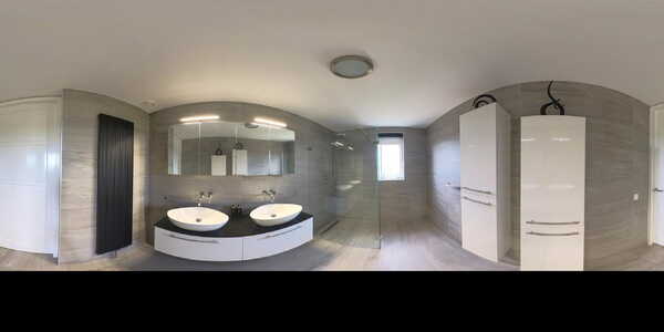 De badkamer, vernieuwd in 2015, is uitgerust met een brede wastafel met twee witte waskommen en bijpassende witte kasten. Het zwarte wastafelblad zorgt voor een stijlvol contrast en geeft de ruimte een moderne uitstraling. Verder beschikt de badkamer over een ruime inloopdouche, mechanische ventilatie en een raam dat zorgt voor extra natuurlijk licht. Een zwarte designradiator maakt het geheel compleet en voegt een eigentijds accent toe. De taupekleurige tegels zorgen voor een warme en sfeervolle ambiance.