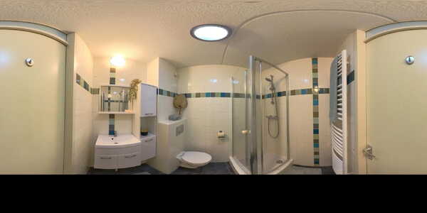 De volledig betegelde badkamer (ca. 4 m²) in wit en grijs beschikt over een douchecabine met glazen wand, hangend toilet en een wastafelmeubel met bergkast, afgewerkt in een stijlvolle en praktische stijl.