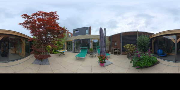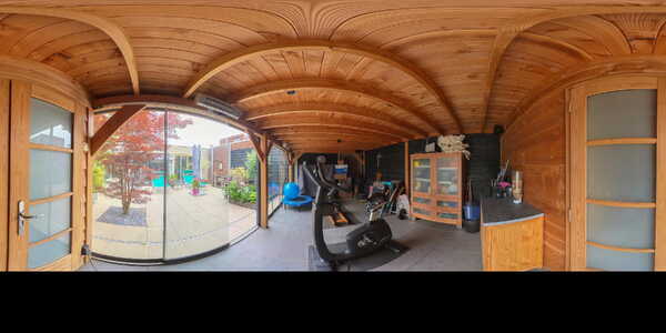 De achtertuin ligt op het zuiden en is betegeld met grote keramische tegels die gemakkelijk te onderhouden zijn. De riante overkapping, gebouwd van Douglas hout en Zweeds rabbat is volledig afsluitbaar met glazen schuifwanden. Hier bevindt zich ook de toegang tot de berging en de Finse sauna, ideaal voor ontspanning na een drukke dag. De tuin wordt compleet afgesloten en biedt optimale privacy door de sfeervolle beplanting en de stenen muur aan de zijkant.