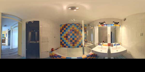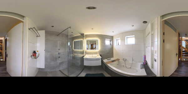 De tweede badkamer (ca. 4 m²) beschikt over een ligbad met een glazen douchewand, twee wastafels en een elektrische radiator, ideaal voor het gezin of gasten. In de aparte kast vindt u de CV-ketel en de hybride warmtepomp, die zorgt voor een duurzaam en energiezuinig wooncomfort.