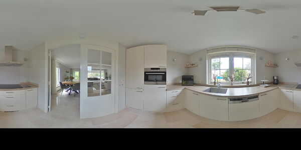 De moderne half/open keuken (ca. 9 m2) is gelegen aan de voorzijde van de woning en is uitgevoerd in een U-opstelling. Deze complete keuken is voorzien van diverse inbouwapparatuur zoals een koelkast, vrieskast, inductie kookplaat, RVS afzuigkap, combimagnetron en een vaatwasser. Het geheel is uitgevoerd in lichte kleuren en afgewerkt met een houten aanrechtblad en natuurstenen vloer met vloerverwarming.