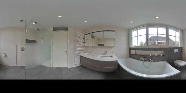 Moderne badkamer (ca. 8 m2) met luxe sanitaire voorzieningen zoals een dubbele wastafel met wandmeubel met spiegel en verlichting, hangend tweede toilet, kunststof ligbad en inloopdouche.