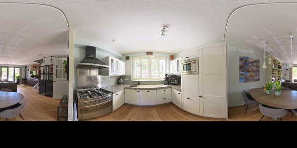 Aan de voorzijde bevindt zich de moderne, U-vormige keuken (ca. 7 m²) met diverse inbouwapparatuur waaronder een 5-pits gasfornuis, oven, magnetron, RVS afzuigkap, vaatwasser, koelkast en een kokend waterkraan. Vanuit de keuken en woonkamer geniet je via grote ramen en openslaande deuren van uitzicht op de gezellige tuin.