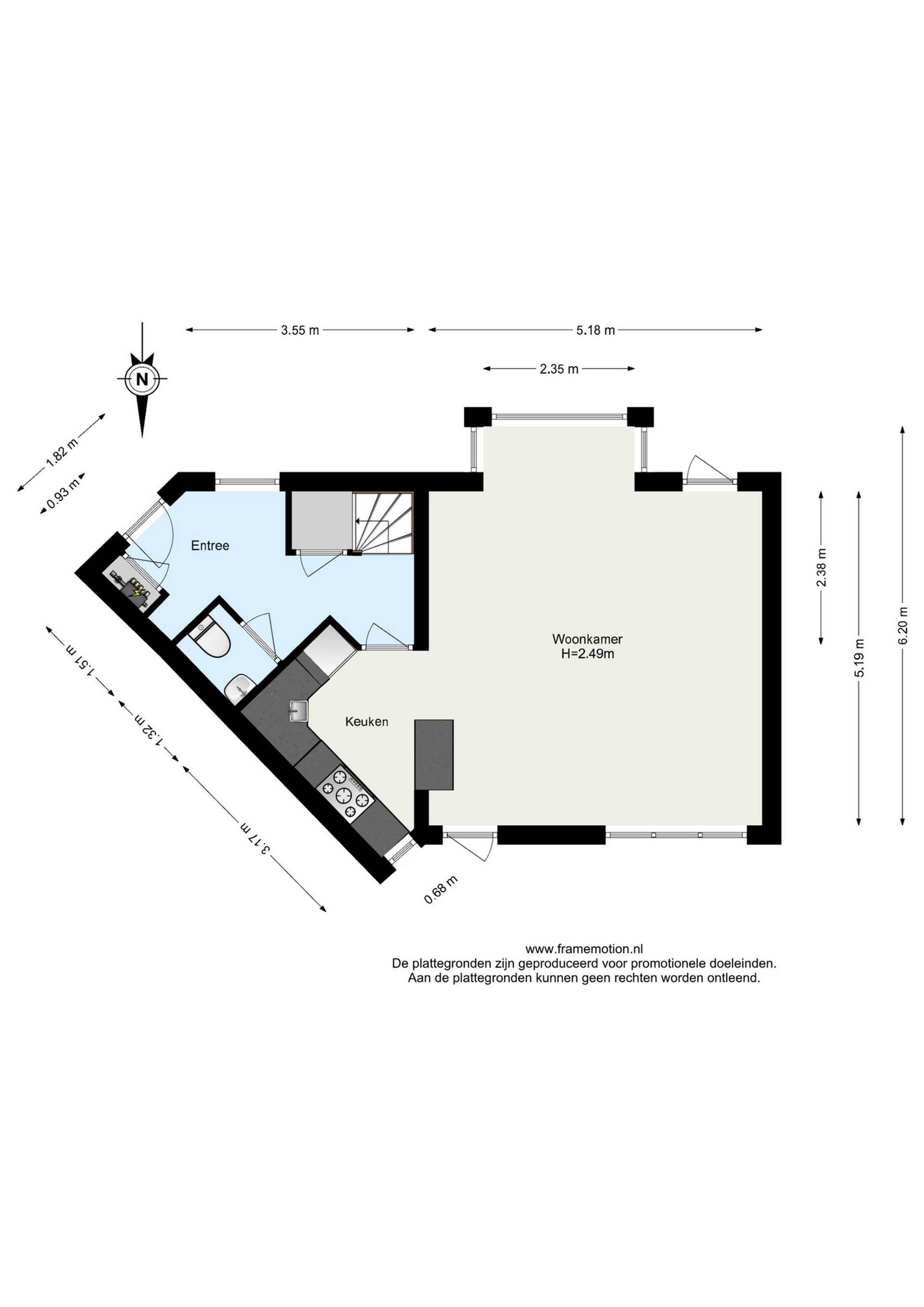 U betreedt de woning via de ruime hal met meterkast en moderne toiletruimte (beige betegeld, voorzien van hangend toilet en fonteintje). Vanuit de hal bereikt u via een stijlvolle glazen deur de lichte woonkamer (ca. 29 m²). Dankzij de ramen aan zowel de voor- als achterzijde is er veel daglicht en heeft u fraai zicht op beide tuinen. Vanuit de woonkamer zijn zowel de voortuin als de achtertuin bereikbaar.