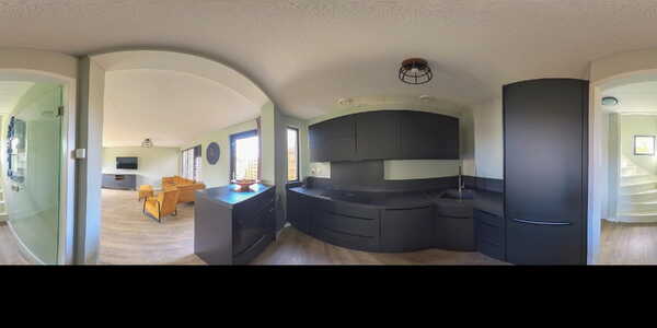 De open keuken (ca. 5 m²) is in 2020 vernieuwd en uitgevoerd in stijlvol zwart met een granieten werkblad. De keuken in hoekopstelling is voorzien van hoogwaardige inbouwapparatuur, waaronder een Bora-inductiekookplaat, combi-oven met stoomfunctie, vaatwasser en koelkast. De begane grond is strak afgewerkt met glad stucwerk en een pvc-vloer.