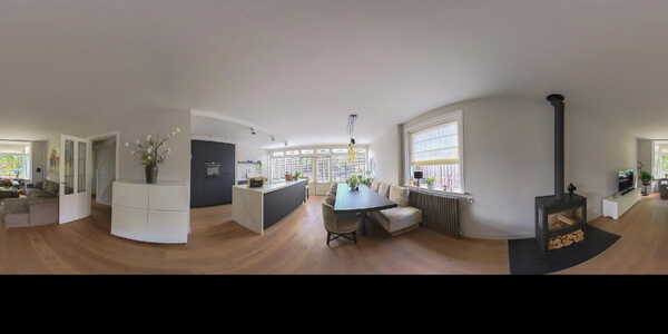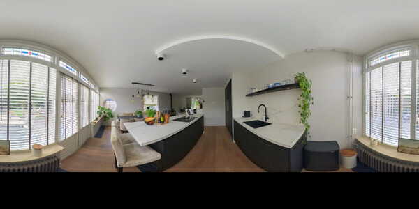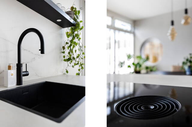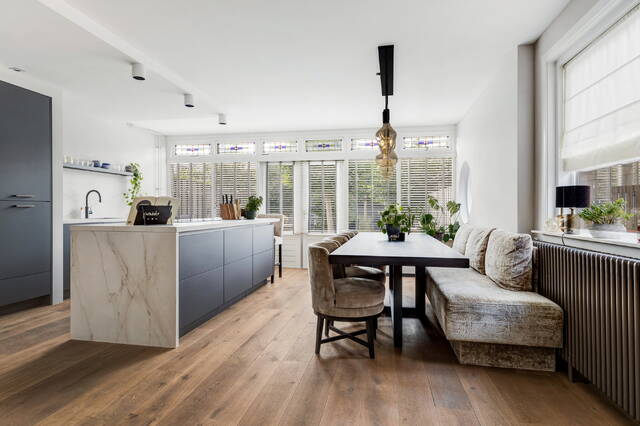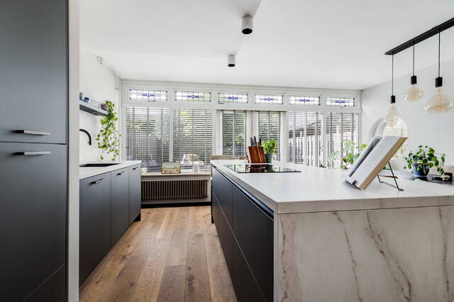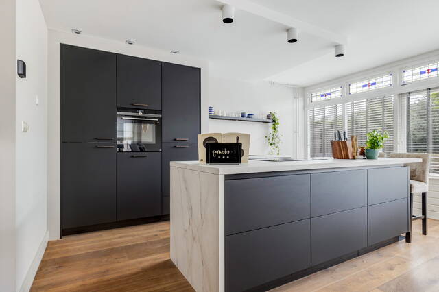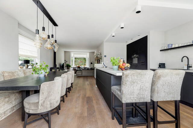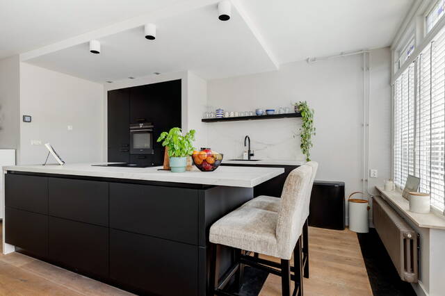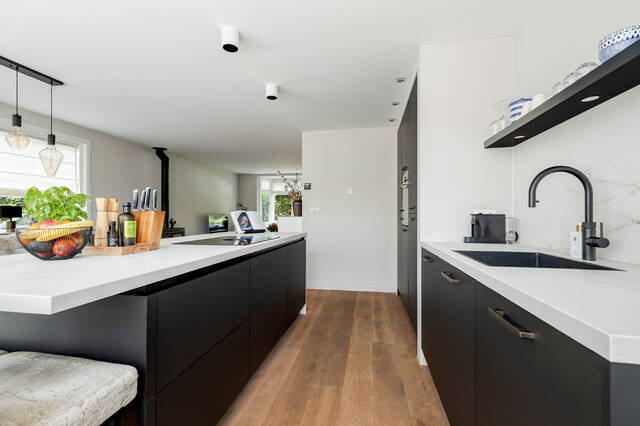 De luxe open keuken (2021) is uitgevoerd in een chique zwart design met een licht Dekton aanrechtblad in marmerlook. De rechte opstelling biedt ruimte aan o.a. een koelkast, vriezer, combi-oven, Quooker en een fraaie zwarte spoelbak. Het kookeiland met eetbar en ruimte voor een grote eettafel maakt dit dé plek om te genieten met familie en vrienden. De totale leefruimte op de begane grond bedraagt ca. 47 m².