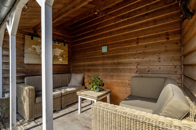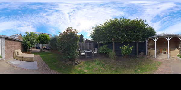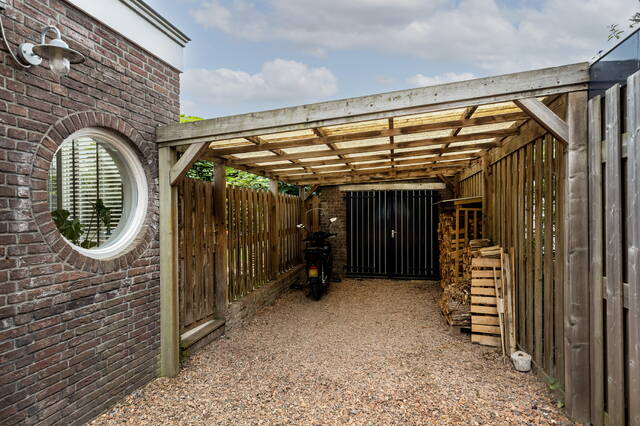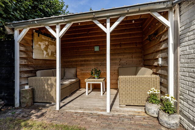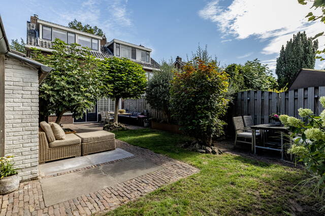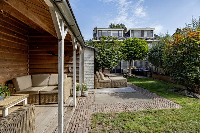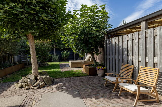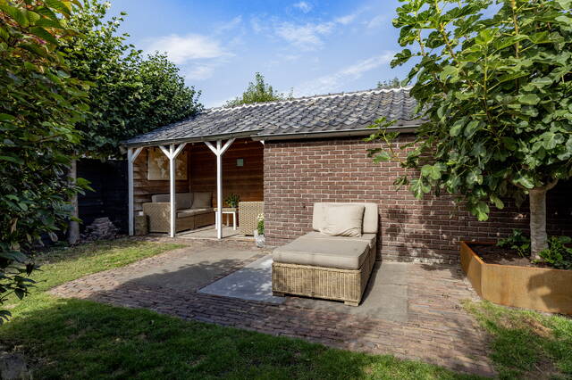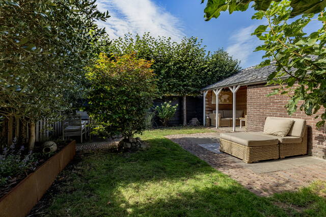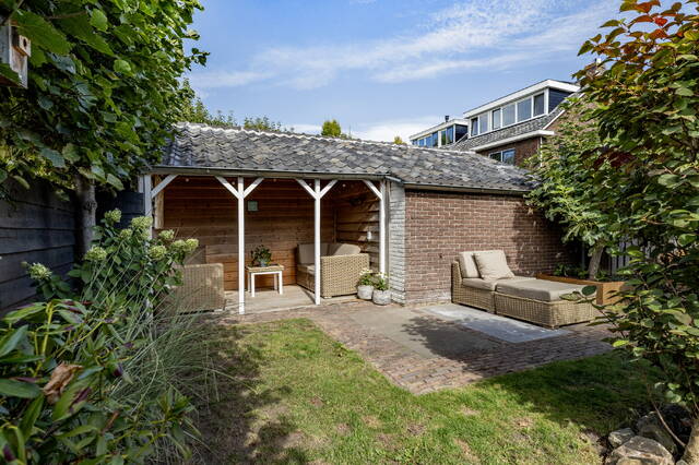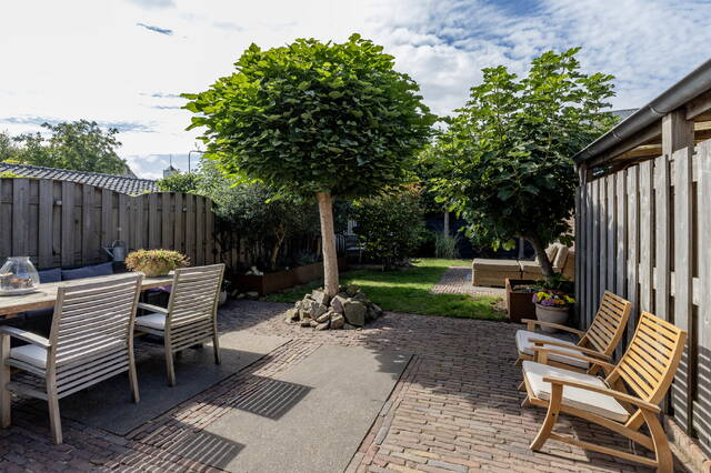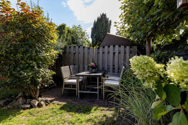 Via openslaande deuren bereikt u de zonnige achtertuin met veel groen, leilinden, een Catalpa en een vijgenboom. De vrijstaande garage is ideaal als berging of hobbyruimte en de veranda (ca. 10 m²) aan de achterzijde van de tuin is een heerlijke plek om beschut buiten te zitten. Zowel de voor- als achtertuin zijn voorzien van in-lite ledverlichting.