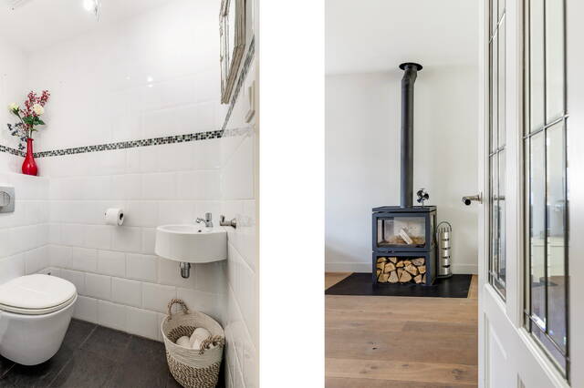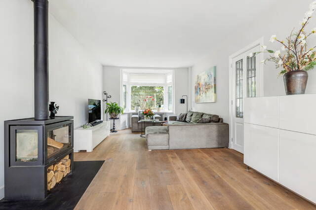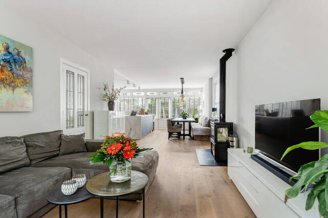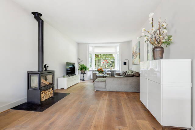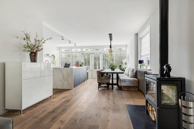 De lichte doorzonwoonkamer is een heerlijke leefruimte met aan de voorzijde een sfeervolle erker en aan de achterzijde de woonkeuken. De houtkachel geeft extra warmte en gezelligheid.