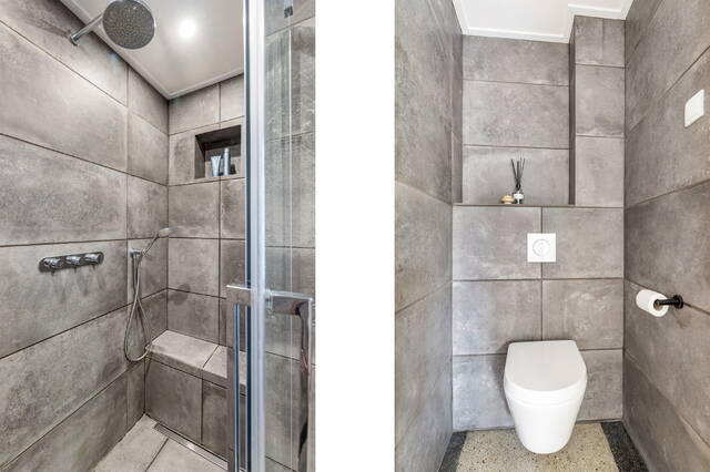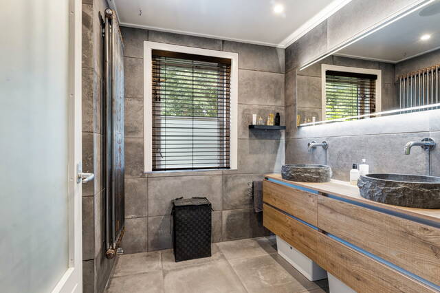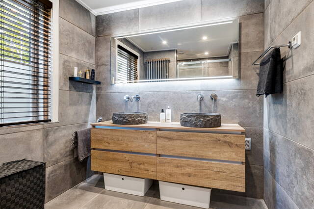 De badkamer (ca. 6 m²) geeft een waar luxe spa-gevoel: een houten wastafelmeubel met natuurstenen waskommen, ruime inloopdouche, vloerverwarming, regendouche, inbouwspeakers (bluetooth), spiegel met ledverlichting, stijlvolle designradiator en strak weggewerkte kranen.