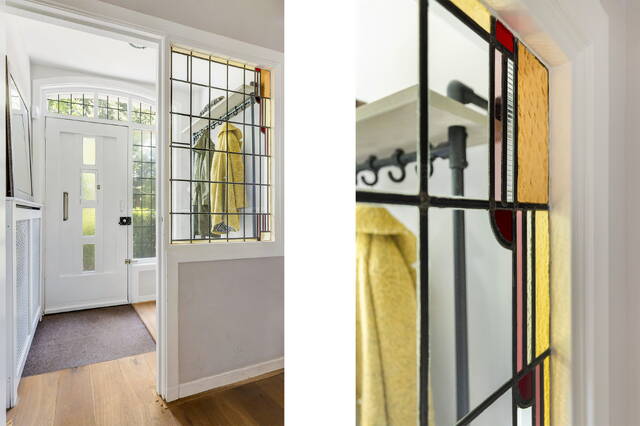 - Nagenoeg al het oorspronkelijke glas in lood is vervangen door glas in lood in dubbel glas