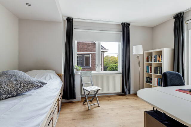 Slaapkamer 1 (ca. 14 m²), gelegen aan de achterzijde, met stucwerk, behang en lambrisering.