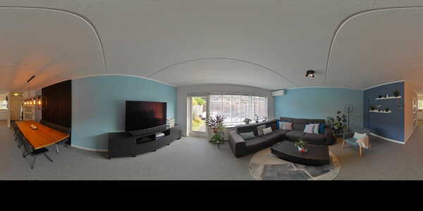 Tuingerichte woonkamer (ca. 32 m2) voorzien van grindvloer met vloerverwarming en airconditioning dat de begane grond verwarmt en koelt. De woonkamer is verder voorzien van een handige trapkast. Middels een loopdeur heeft u toegang tot de zonnige achtertuin.