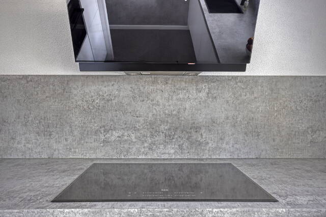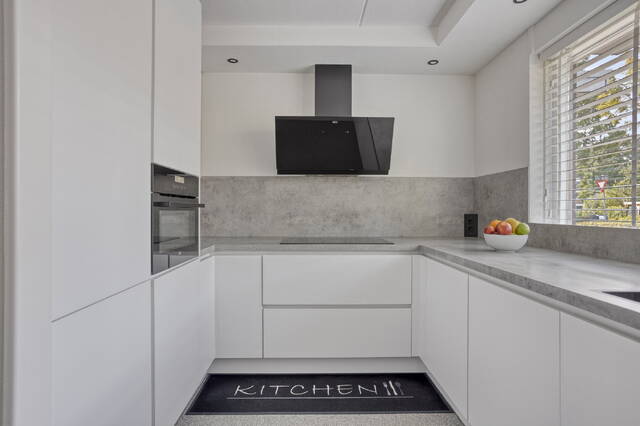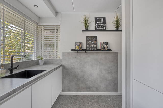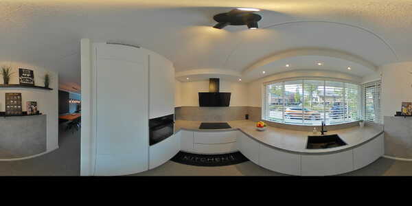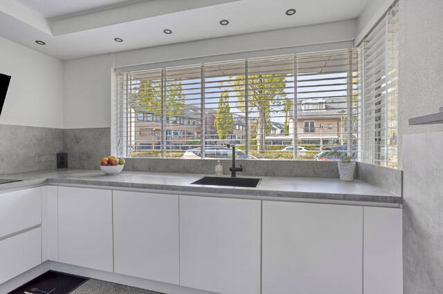 De moderne halfopen keuken (ca. 9 m2) is gelegen aan de voorzijde van de woning en is uitgevoerd in een U-opstelling. De keuken is voorzien van diverse inbouwapparatuur zoals een koelkast, vriezer, inductie kookplaat, design afzuigkap, combi ovenmagnetron en een vaatwasser. Verder is de keuken voorzien van een zwarte spoelbak. Het geheel is uitgevoerd in wit en afgewerkt met een licht grijs kunststof aanrechtblad, grindvloer met vloerverwarming en spotjes. De raampartij aan de keukenkant beschikt over een screen met zuignappen.