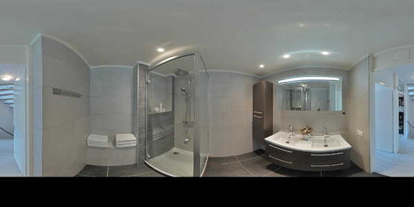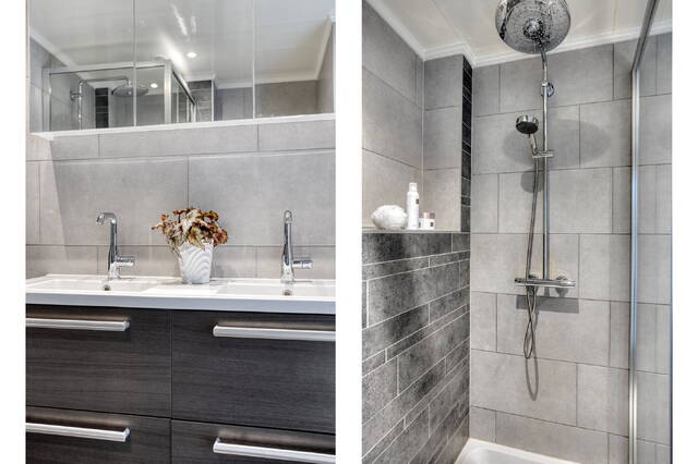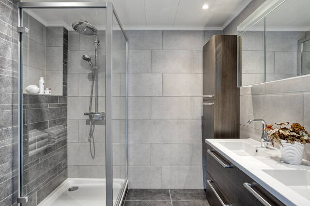 Moderne badkamer (ca. 5 m2) met sanitaire voorzieningen zoals een dubbele wastafel met wastafelmeubel, spiegel met spiegelkast en douchecabine met regendouche. De badkamer is geheel betegeld in een licht grijze kleurstelling en beschikt over een elektrische vloerverwarming.