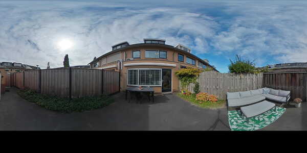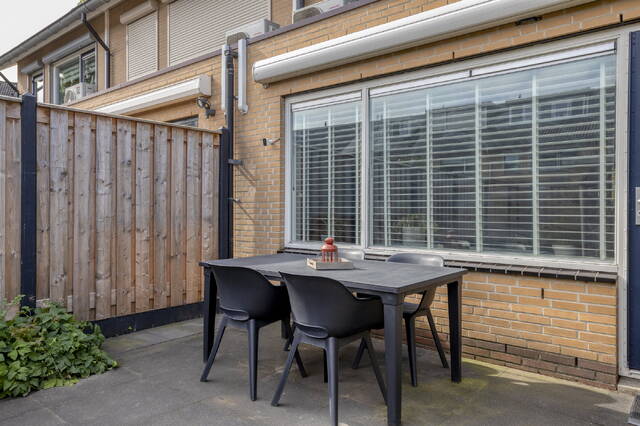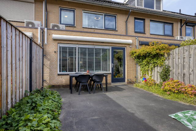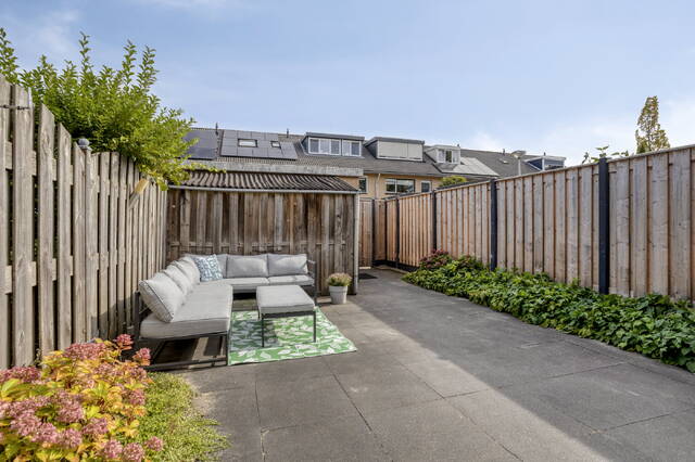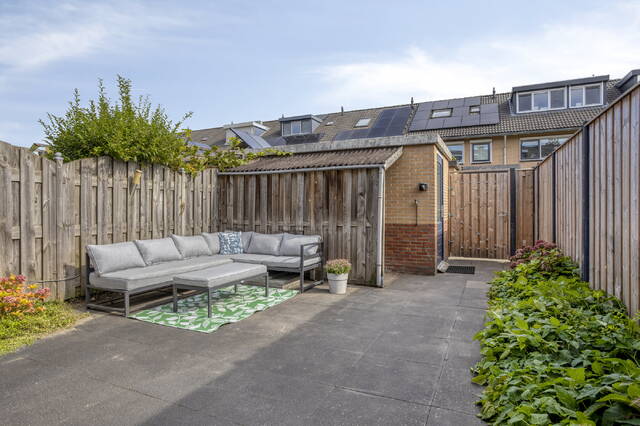 De diepe achtertuin is gunstig gelegen op het oosten en beschikt over een achterom, bestrating, beplanting, een elektrisch bedienbaar zonnescherm met afstandsbediening, buitenkraan, berging en een fietsenhoek voor de fietsen/brommers.