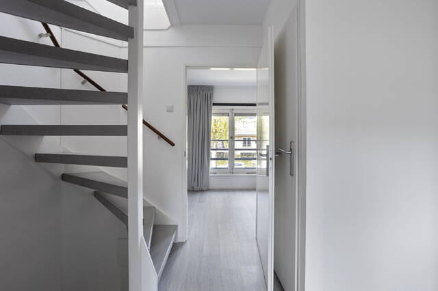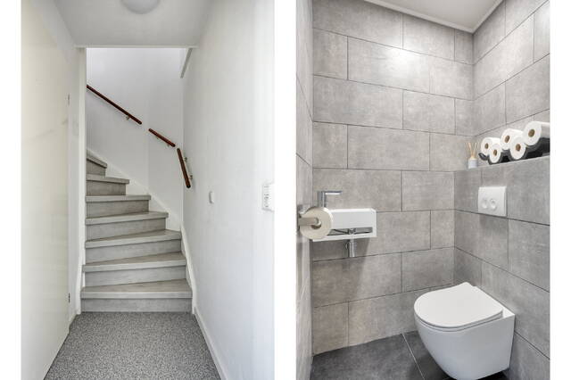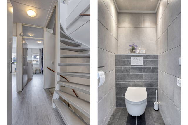 De trapopgang naar de 1e en 2e verdieping is voorzien van traprenovatie in een licht grijze kleursteling. De toiletruimte is voorzien van een hangend toilet en fonteintje met een waterkraan met sensor. De toiletruimte is geheel betegeld in een licht grijze kleurstelling.