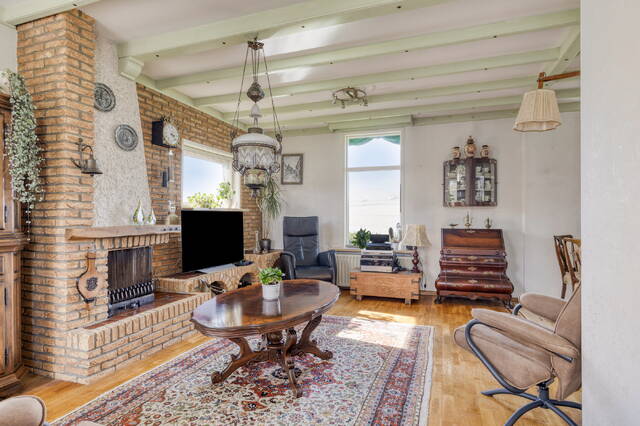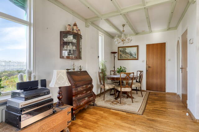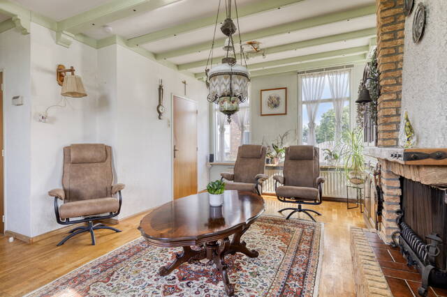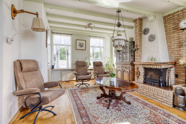 De ruime woonkamer in L-vorm (ca. 28 m2) biedt ruimte en sfeer. Authentieke plafondbalken en de houten open haard zorgen voor een warme uitstraling, terwijl de klassieke parketvloer de karakteristieke stijl van 1923 benadrukt. Dankzij de grote raampartijen is de kamer heerlijk licht. Het slimme L-formaat maakt het bovendien mogelijk om een gezellig eetgedeelte te creëren, ideaal voor lange avonden tafelen met familie en vrienden. Via de woonkamer is het souterrain bereikbaar.