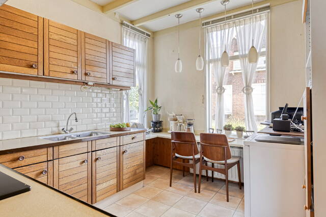 Aan de voorzijde van de woning bevindt zich de keuken (ca. 10 m2), uitgevoerd met een praktische L-vormige opstelling. Hoewel modernisering wenselijk is, is de keuken functioneel en compleet ingericht met onder andere een 4-pits gaskookplaat, oven, koelkast, afzuigsysteem, dubbele spoelbak en een close-in boiler. Dankzij de indeling is er voldoende werk- en bergruimte, en kunt u de keuken geheel naar eigen smaak en stijl vernieuwen.