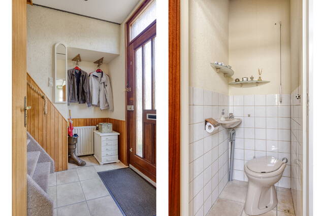 Entree, hal met meterkast, trap naar de 1e verdieping. Toiletruimte voorzien van een duoblok en fonteintje. De toiletruimte is gedeeltelijk betegeld in een lichte kleurstelling.