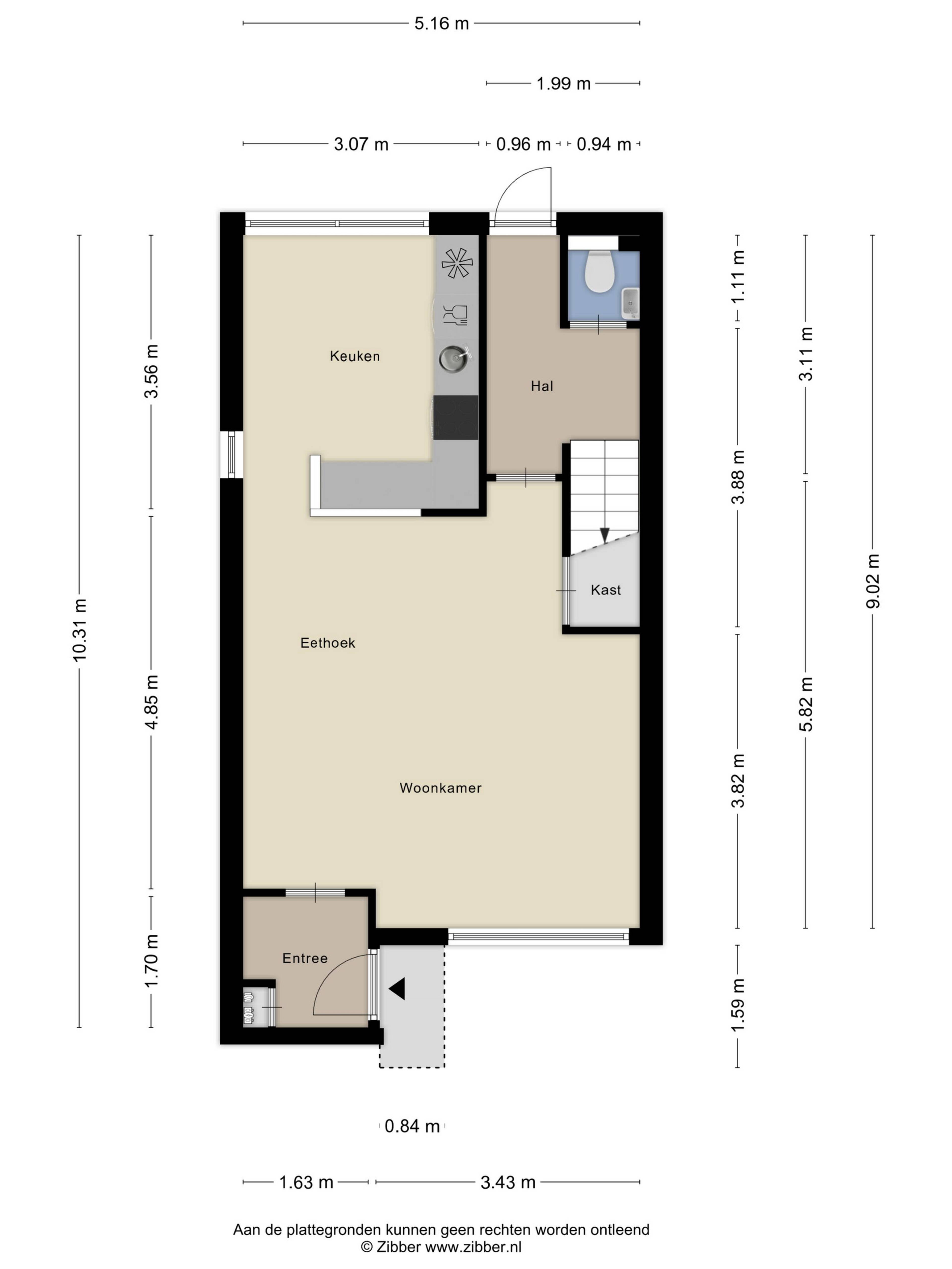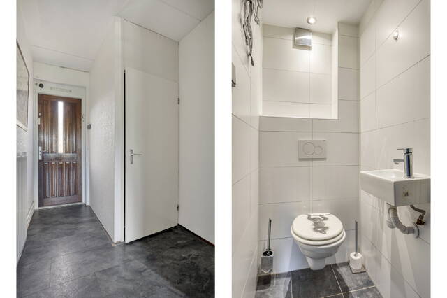 Binnenhal met trap naar de 1e verdieping, toegang tot de achtertuin en een toiletruimte voorzien van een hangend toilet en fonteintje. De toiletruimte is geheel betegeld en afgewerkt met spotjes.