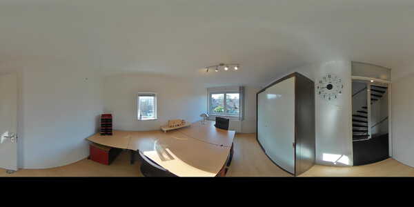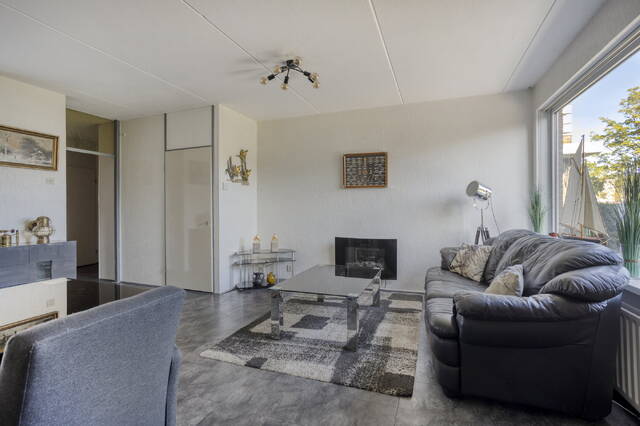 De ruime en lichte woonkamer (ca. 30 m2) is gelegen aan de voorzijde van de woning en is voorzien van een lichte laminaatvloer en een praktische trapkast.