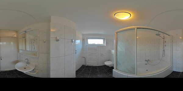 De badkamer (ca. 7 m2) heeft sanitaire voorzieningen zoals een ligbad met douchescherm en douche, wastafel, spiegel met spiegelkast, verlichting, hangend tweede toilet en de wasmachine- en drogeraansluiting. De badkamer is geheel betegeld in een lichte kleurstelling.