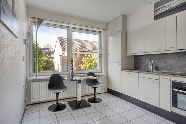 De moderne open keuken (ca. 11 m2) is gelegen aan de achterzijde van de woning en is uitgevoerd in een L-opstelling. Deze complete keuken is voorzien van een koelkast, vrieskast, inductie kookplaat, afzuigkap, oven en een vaatwasser. Tevens beschikt de keuken over een enkele spoelbak en kastruimte.