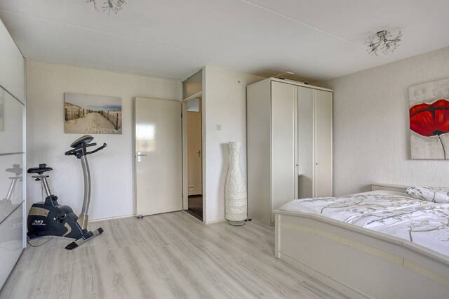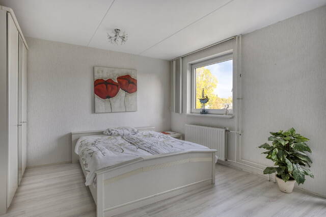 Slaapkamer 3 (ca. 10 m2) is gelegen aan de voorzijde van de woning en is voorzien van linoleum vloer en bergruimte achter het knieschot. Deze slaapkamer biedt een aangename natuurlijke lichtinval door de grote raampartij.